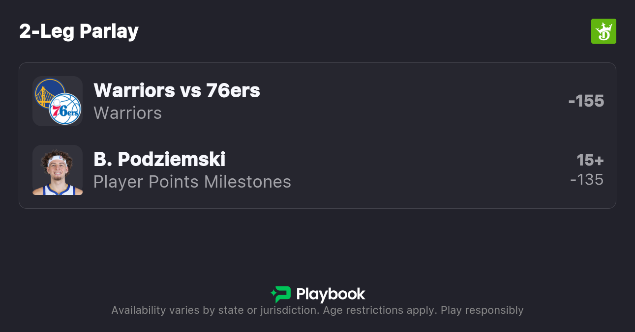 My Warriors vs. 76ers best bet is a same game parlay combining Golden State moneyline and Brandin Podziemski to score 15+ points. Make sure to find the best odds by checking our live NBA odds page.