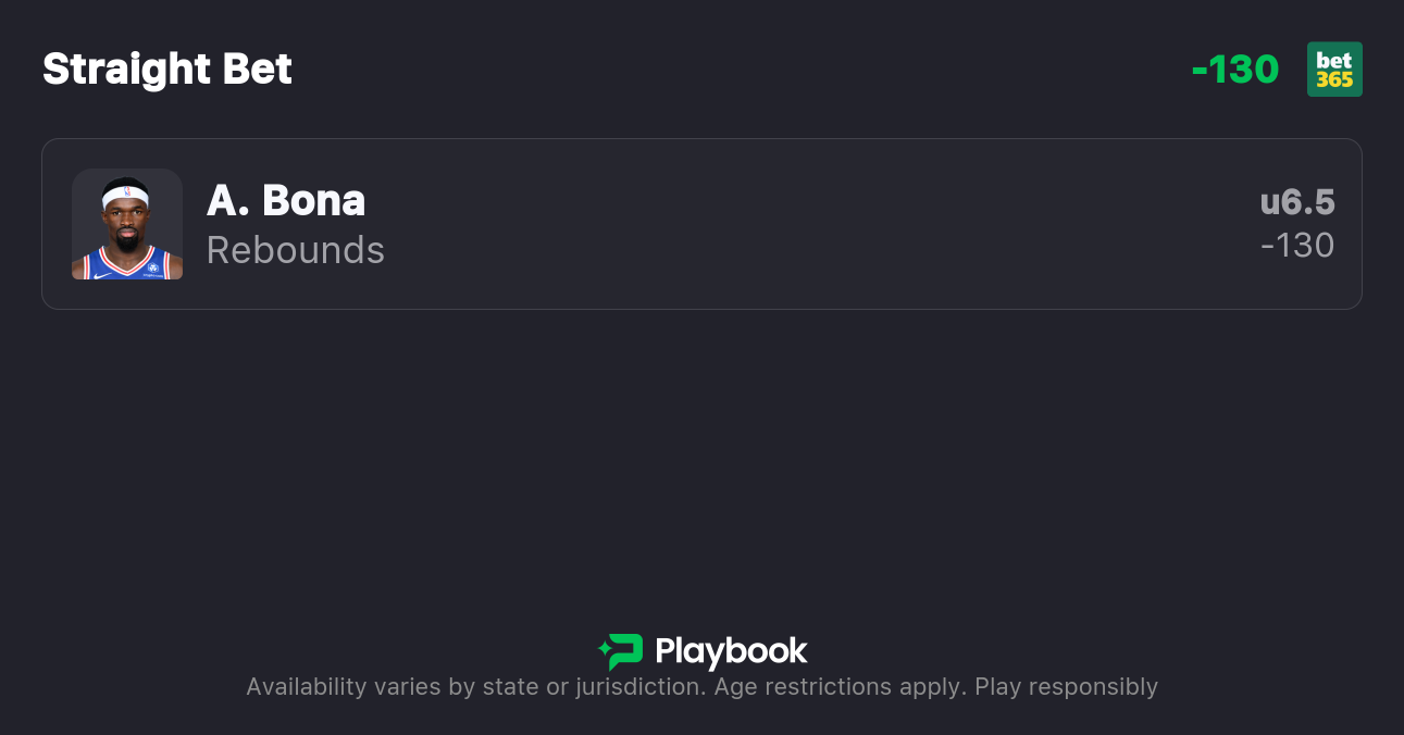 With Philadelphia likely to lead early and potentially rest starters, Bona may see his usual 17-minute workload (his average in the past 10 games), but the statistical trend suggests he remains far from a high-volume rebounding threat.