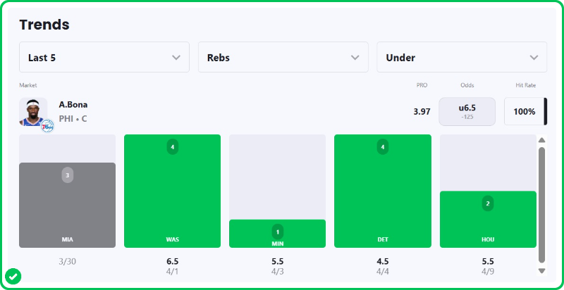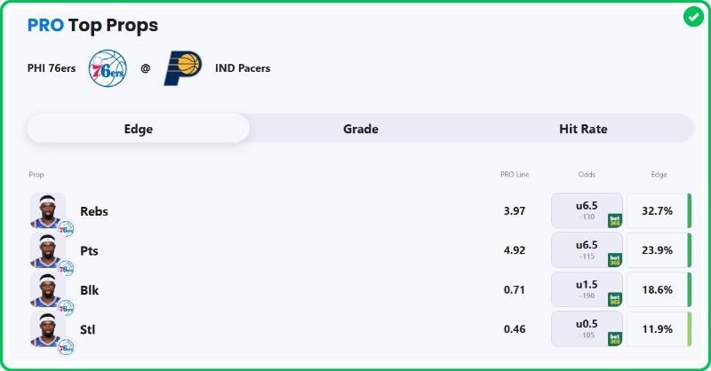 - 76ers vs Pacers pick: Adem Bona Under 6.5 Rebounds (-130)
