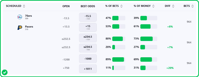 The Sixers are 15-point favorites over the Pacers on the spread (76ers -15), with the over/under set at 233.5 total points. Philadelphia is a -1200 favorite to win outright on the moneyline, while Indiana is +750 to pull off the upset.