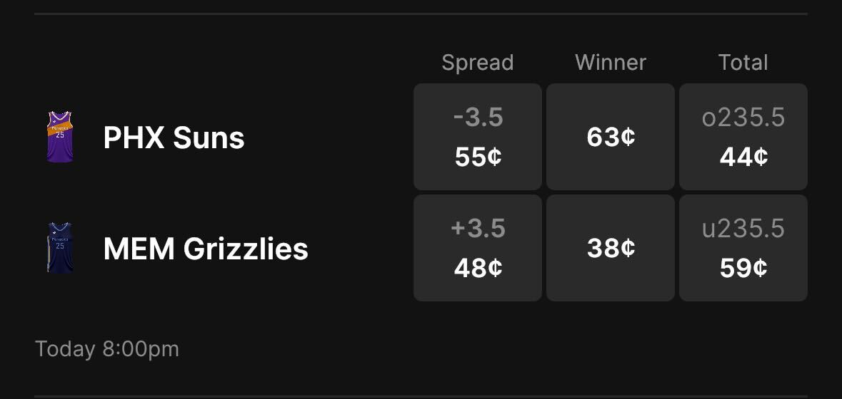The Suns are 3.5-point favorites over the Grizzlies on the spread (Suns -3.5), with the over/under set at 235.5 total points. Phoenix is a 63-cent favorite to win outright, while Memphis is priced at 38 cents to pull off the upset on Fanatics Markets.