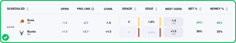 The Suns are 1.5-point favorites over the Bucks on the spread (Suns -1.5), with the over/under set at 217.5 total points. Miami is a -125 favorite to win outright on the moneyline, while Milwaukee is +105 to pull off the upset.