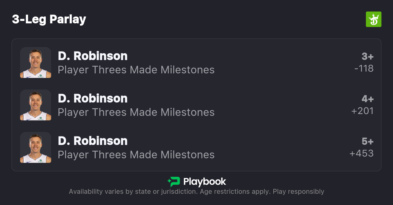 So, in order to activate that turnaround, they need Robinson (and Tobias Harris, Kevin Huerter, and maybe you, Daniss Jenkins) to get going. But for now, Robinson is getting the looks and the volume. He has gone over 2.5 makes in all three games this series on 6, 7, and 8 attempts, respectively. However, he has made exactly three in all of these games.