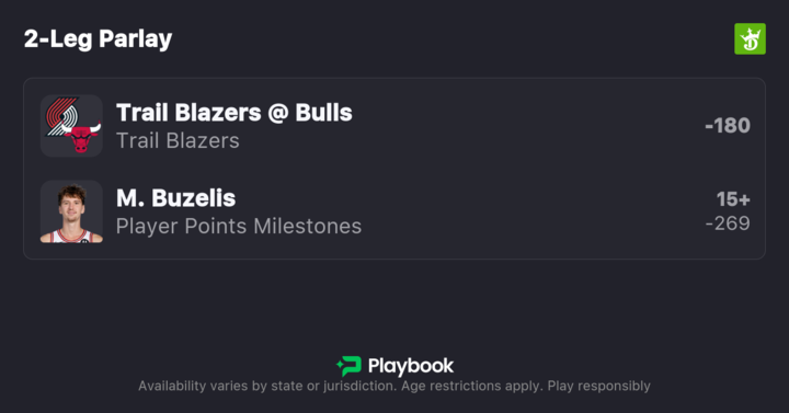 - Trail Blazers vs Bulls pick: Trail Blazers Moneyline / Matas Buzelis 15+ Points (+112)