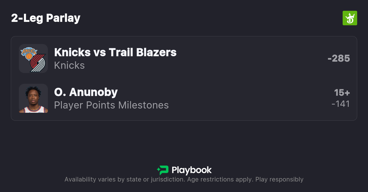 My Knicks vs Trail Blazers best bet is a same game parlay combining Knicks moneyline and OG Anunoby to score 15+ points. Make sure to find the best odds by checking our live NBA odds page.