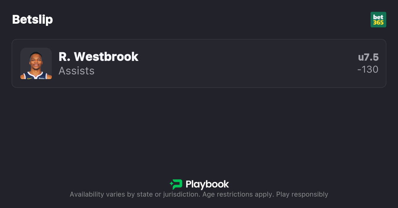 - Russell Westbrook Under 7.5 Assists (-130, bet365)