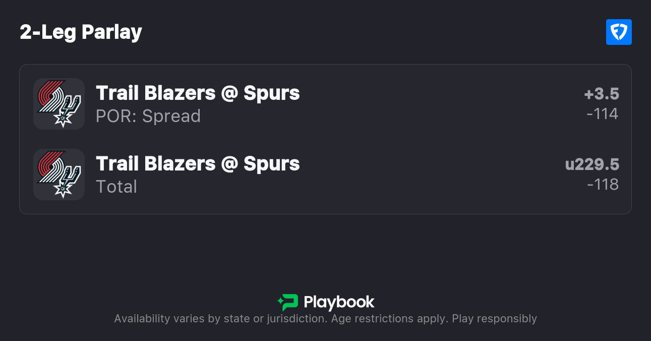 - Trail Blazers vs Spurs picks: Trail Blazers +3.5 (-115), Under 229.5 (-115)