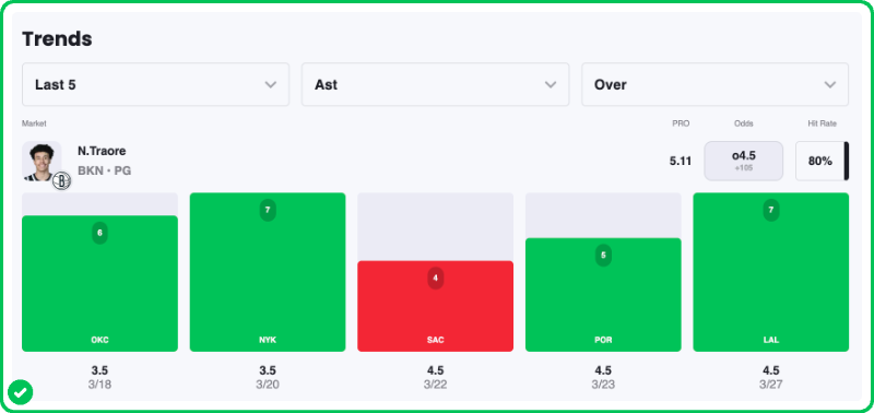 As a result, Traore has recorded 5+ assists in four of his last five games, while reaching 6+ assists in three of those contests — with his lone Under during that span ringing in exactly at four assists.