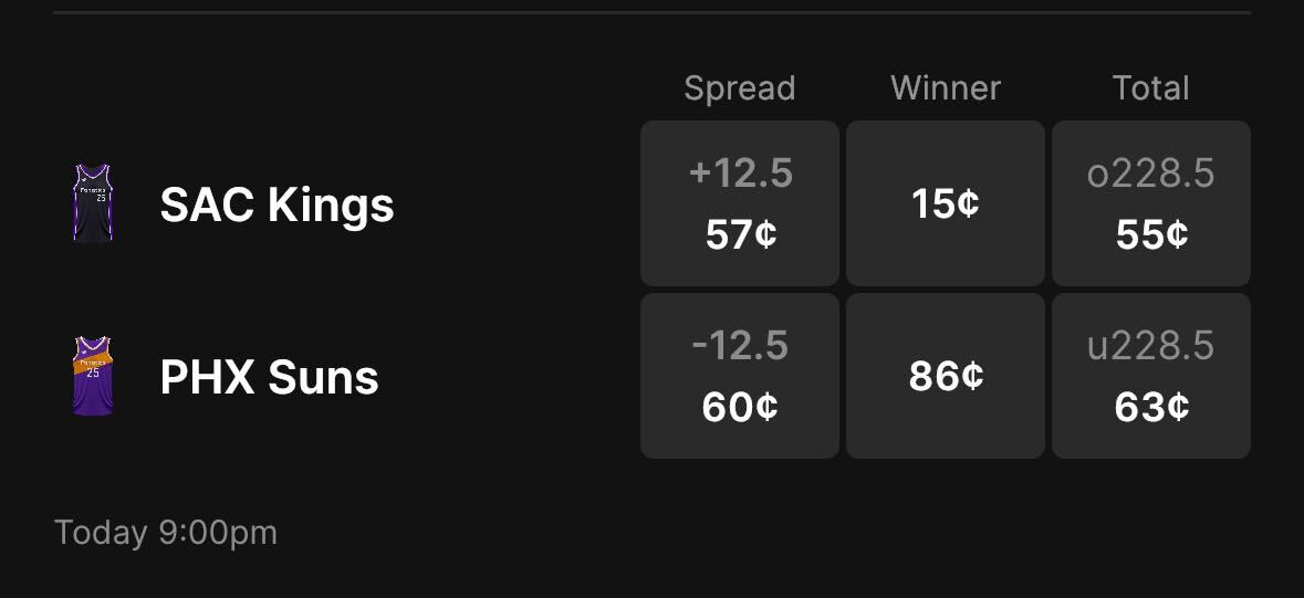 The Suns are 12.5-point favorites over the Kings on the spread (Suns -12.5), with the over/under set at 228.5 total points. Phoenix is an 86-cent favorite to win outright, while Sacramento is priced at 15 cents to pull off the upset on Fanatics Markets.