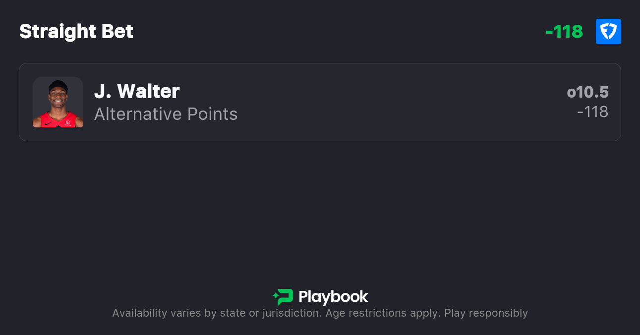 Walter has excelled in games with larger spreads or against teams with defensive lapses, evidenced by his 21-point explosion against the Jazz — and 18-point nights against both the Pelicans and Bulls in late March.