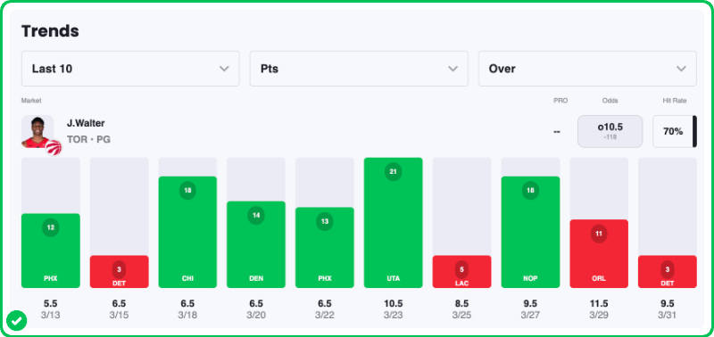 Action PRO is projecting Walter to score 13.81 points for the Raptors tonight, showing a significant 28.3% edge against the market compared to his current prop line of 10.5. This differential is substantial enough to earn the Over an A+ grade in our betting system.