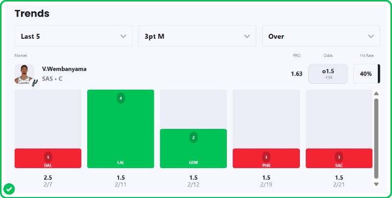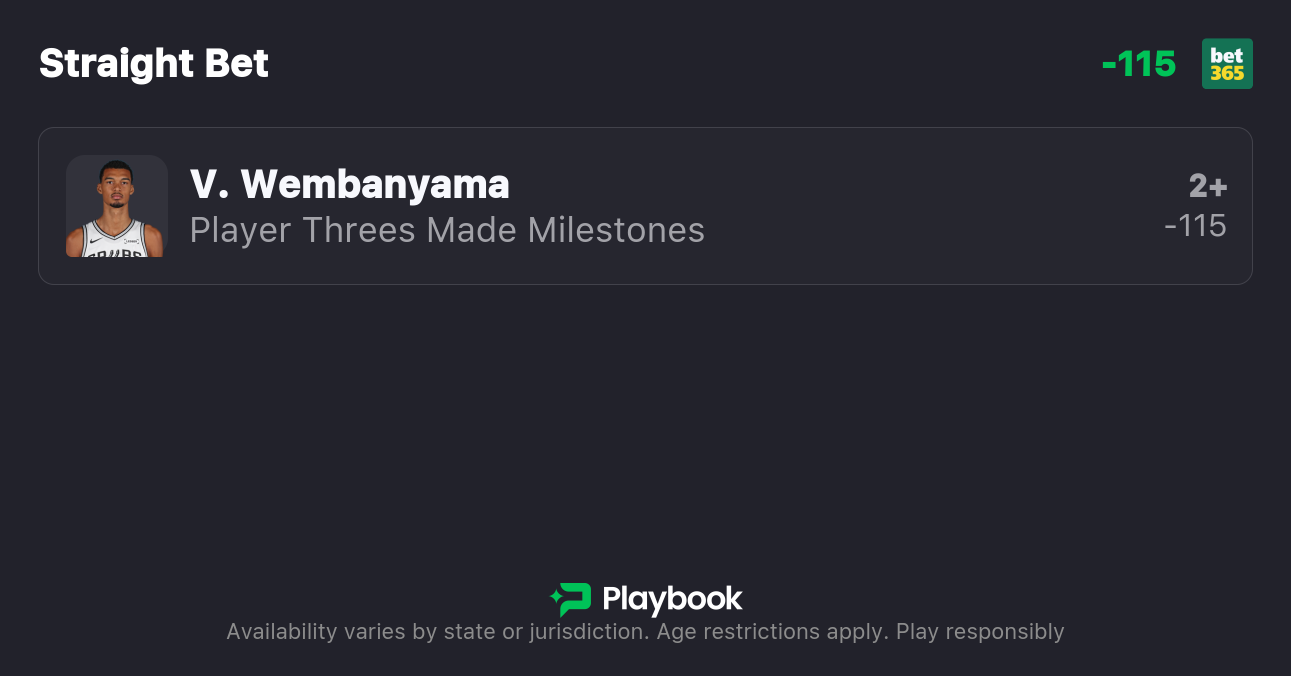 Pick: Victor Wembanyama Over 1.5 Three-Pointers Made (-115, bet365)