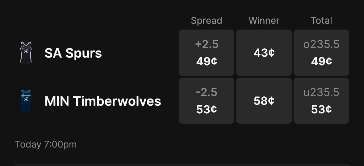 The Timberwolves are 2.5-point favorites over the Spurs on the spread (Timberwolves -2.5), with the over/under set at 235.5 total points. Minnesota is a 58-cent favorite to win outright, while San Antonio is priced at 43 cents to pull off the upset on Fanatics Markets.