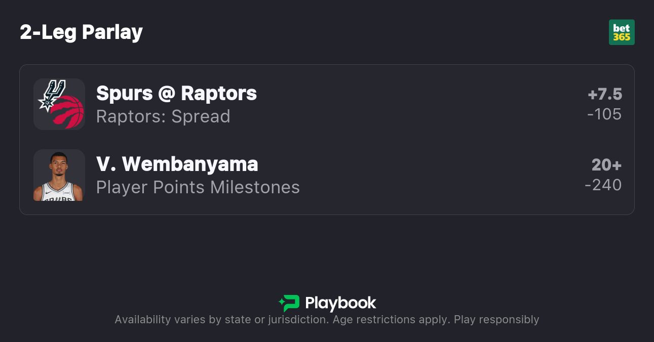 - Spurs vs Raptors pick: Raptors +7.5 / Victor Wembanyama 20+ Points (+170)
