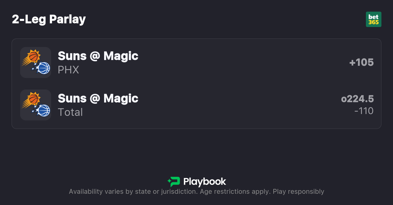 - Suns vs Magic picks: Suns Moneyline (+110), Over 224.5 (-110)