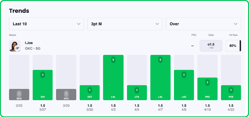As you can see with our Action Network Trends, in his last 10 games, he has an 80% hit rate on over 1.5 made 3-pointers.