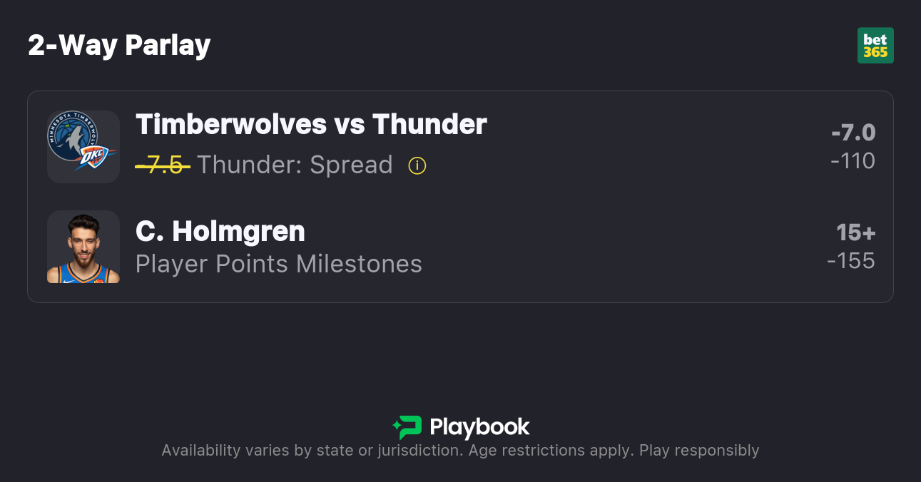 My Timberwolves vs Thunder best bet is a same game parlay combining Oklahoma City to cover the spread and Chet Holmgren to score 15+ points, with the best price currently available at bet365.