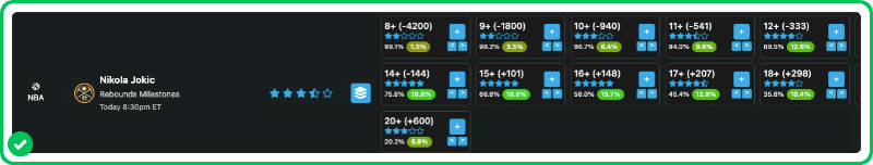 With Denver down 1-2, expect maximum effort from the Joker tonight. He is more than capable of snagging 20 boards when the intensity ramps up, and our Pick Labs Ladder Tool is showing a massive edge on his higher-rebound rungs: