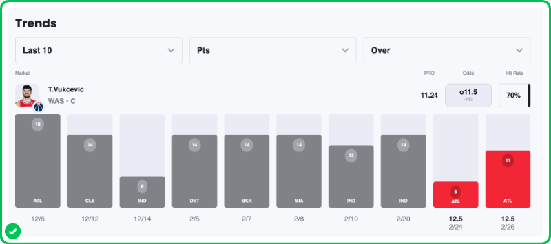 Wizards' center Tristan Vukcevic has gone over 11.5 points in five of his last seven games, mostly coinciding with an increased role now that Sarr is out of the lineup.