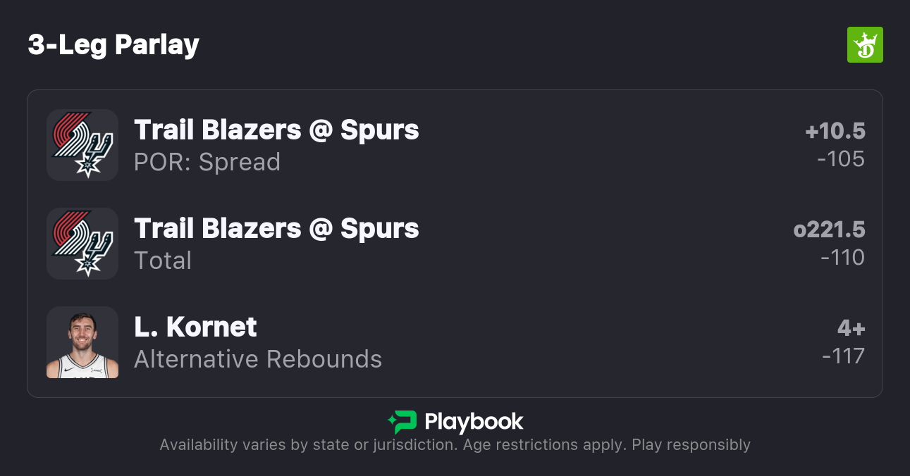The Spurs are 10.5-point favorites over the Blazers on the spread (Spurs -10.5), with the over/under set at 221.5 total points. San Antonio is a -535 favorite to win outright on the moneyline, while Portland is +400 to pull off the upset.