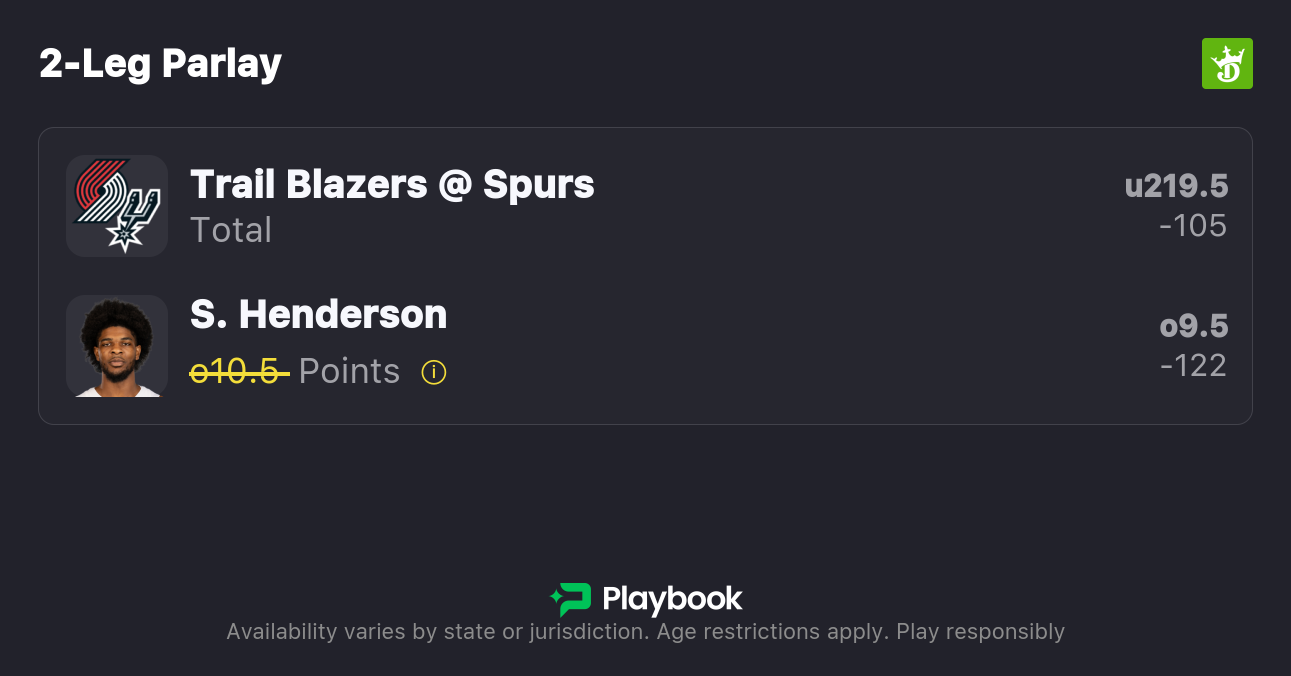 My Spurs vs. Trail Blazers best bet for Game 2 is on tonight's contest to stay under 219.5 total points. Make sure to find the best odds by checking our live NBA odds page.