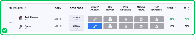 This total opened 221 and we’re tracking the majority of tickets and money on the Over — and yet, this number has moved down two points. That sharp action, combined with San Antonio’s rock solid perimeter defense gives me confidence they’ll keep the Blazers down.