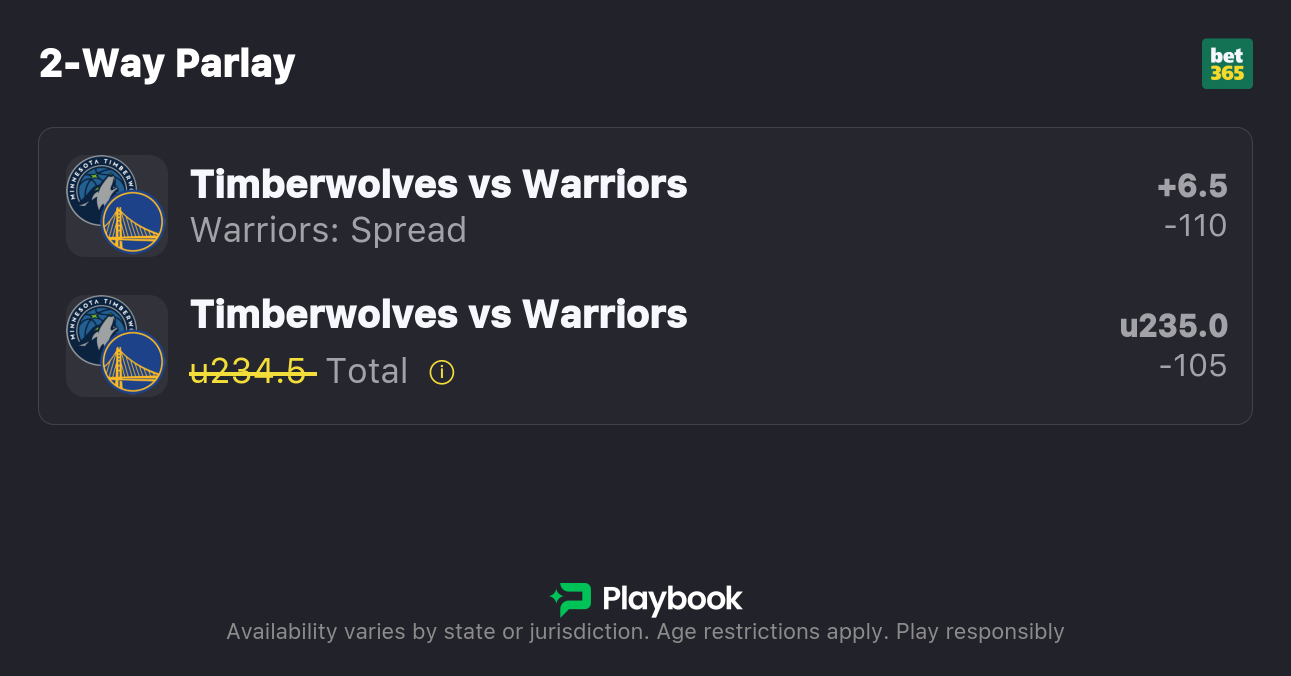 The Timberwolves are 6.5-point favorites over the Warriors on the spread (Timberwolves -6.5), with the over/under set at 234.5 total points. Minnesota -270 favorite to win outright on the moneyline, while Golden State is +220 to pull off the upset.