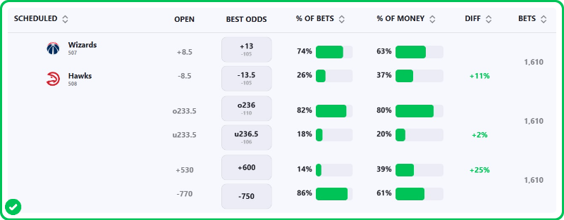 The Hawks are 13.5-point favorites over the Wizards on the spread (Hawks -13.5), with the over/under set at 236.5 total points. Atlanta is a -850 favorite to win outright on the moneyline, while Washington is +575 to pull off the upset.