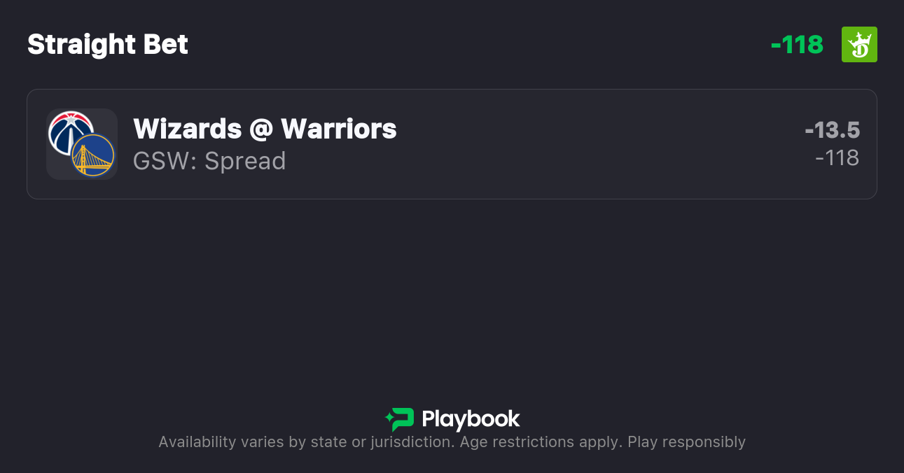 - Wizards vs Warriors pick: Warriors -13.5 (-118)
