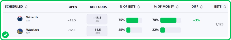 It focuses on regular season games where the favorite opens with a significant spread yet receives limited betting support, often below 40% — which applies to the Warriors in tonight's matchup against the Wizards.