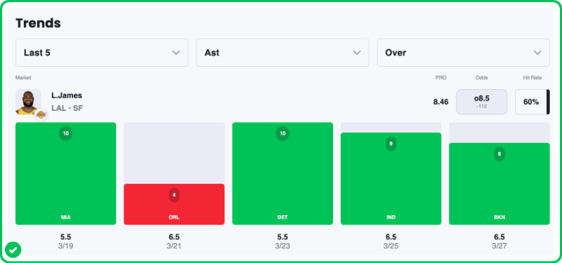 LeBron has already has recorded eight assists in four of his last five games. However, he is averaging 9.5 assists in six games without Doncic this season, including 10 assists in three straight games that Doncic missed last month.