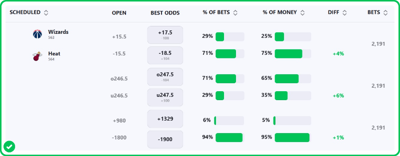 The Heat are 17.5-point favorites over the Wizards on the spread (Heat -17.5), with the over/under set at 247.5 total points. Miami is a -2000 favorite to win outright on the moneyline, while Washington is +1100 to pull off the upset.