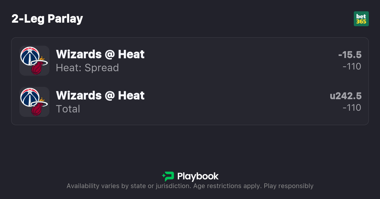 The Heat are 15.5-point favorites over the Wizards on the spread (Heat -15.5), with the over/under set at 242.5 total points. Miami is a -950 favorite to win outright on the moneyline, while Washington is +625 to pull off the upset.