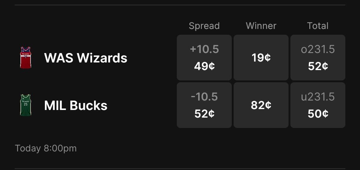 The Bucks are 10.5-point favorites over the Wizards on the spread, with the over/under set at 231.5 total points. The Bucks are 82-cent favorites to win outright, while the Wizards are 19-cent underdogs to pull off the upset on Fanatics Markets.