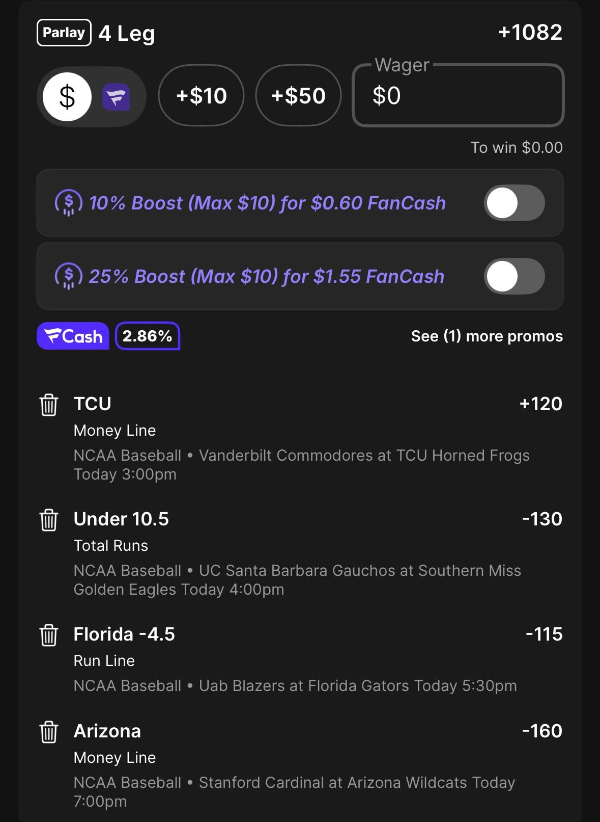 Lastly, we target an Arizona team that's underpriced with their ace Owen Kramkowski on the hill. Don't let the 5.48 ERA fool you — Kramkowski is the bona fide ace of a deep Wildcats staff and should be sharp against a Stanford lineup that's projected to be below average this season despite Rintaro Sasaki looming in the middle of it.