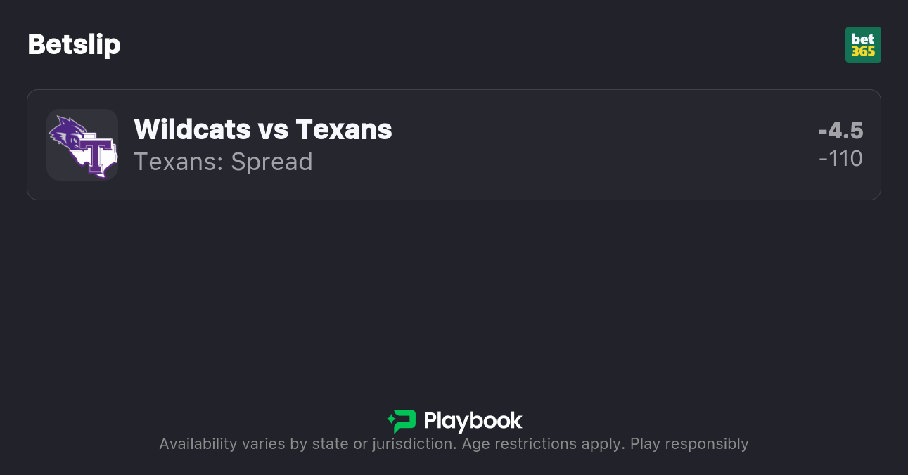 The situational spot seems good, as the Texans need a win after four straight losses, and there’s some revenge to factor in after the Wildcats beat Tarleton in Stephenville to start this four-game losing streak.