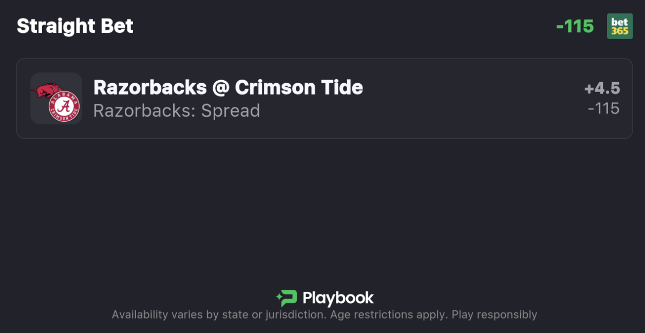 - Arkansas vs Alabama moneyline: Arkansas +180, Alabama -220