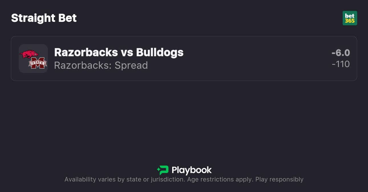- Arkansas vs Mississippi State spread: Arkansas -6.5