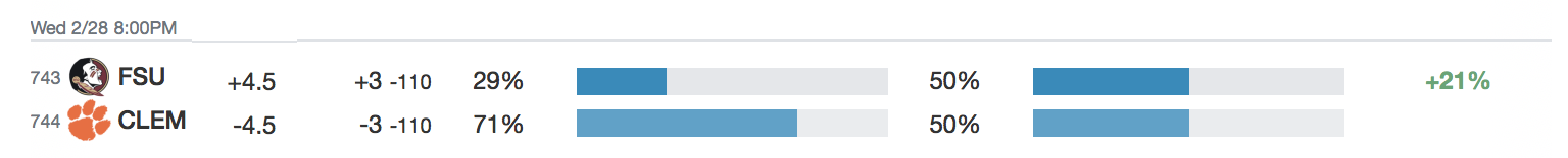The Noles are coming off an ugly 92-72 loss to NC State on Saturday, which might explain why they are attracting so few bets. FSU has already beaten a ranked Clemson team once this season and will look for the season sweep on Wednesday night.