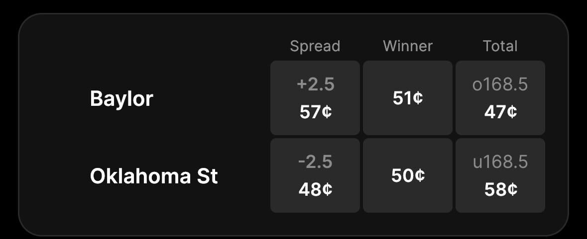 Oklahoma State is favored by 2.5 points on the spread with a price of 50 cents to win and the total set at 168.5 points on Fanatics Markets.