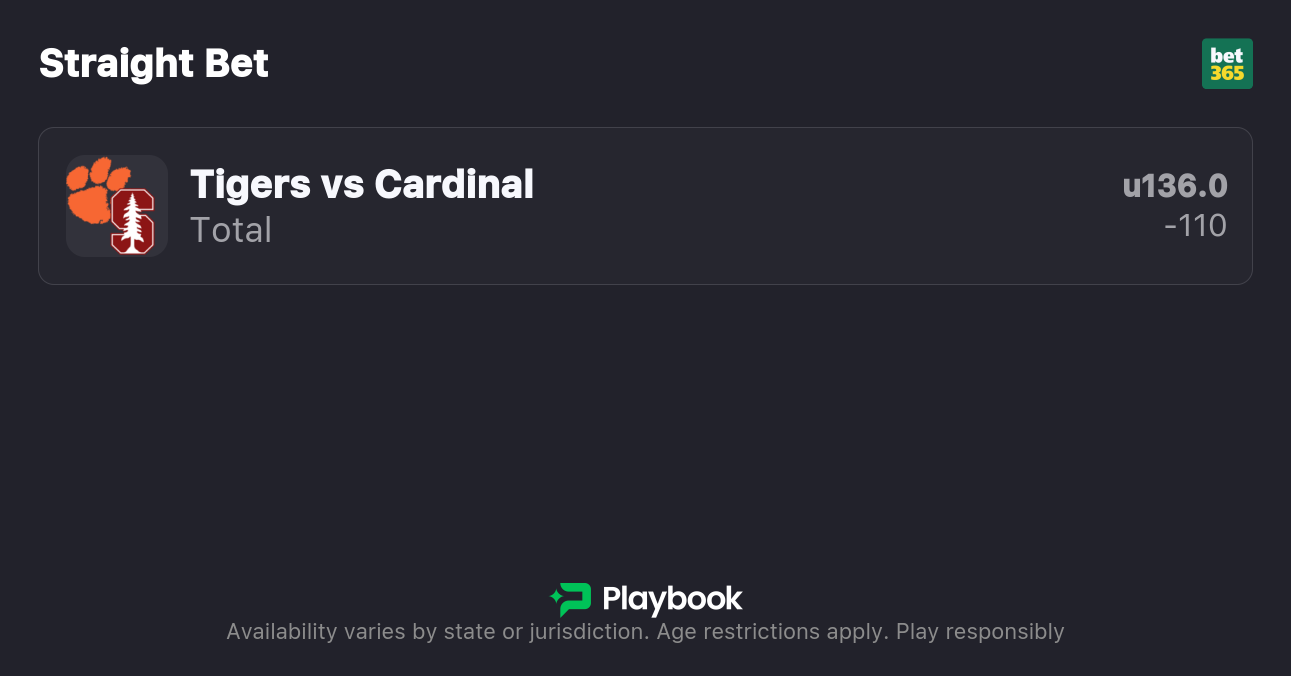 - Clemson vs Stanford moneyline: Clemson -230, Stanford +190