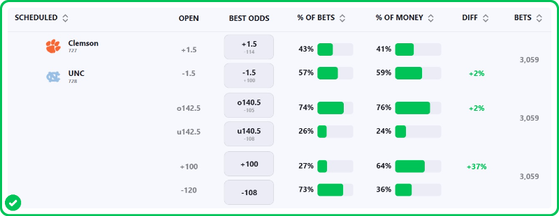 - Clemson vs UNC spread: Clemson +1.5 (-120), UNC -1.5 (+100)