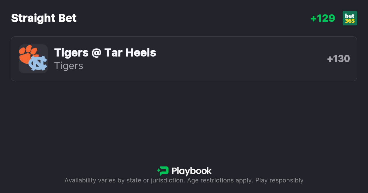 - Clemson vs UNC moneyline: Clemson +130, UNC -155