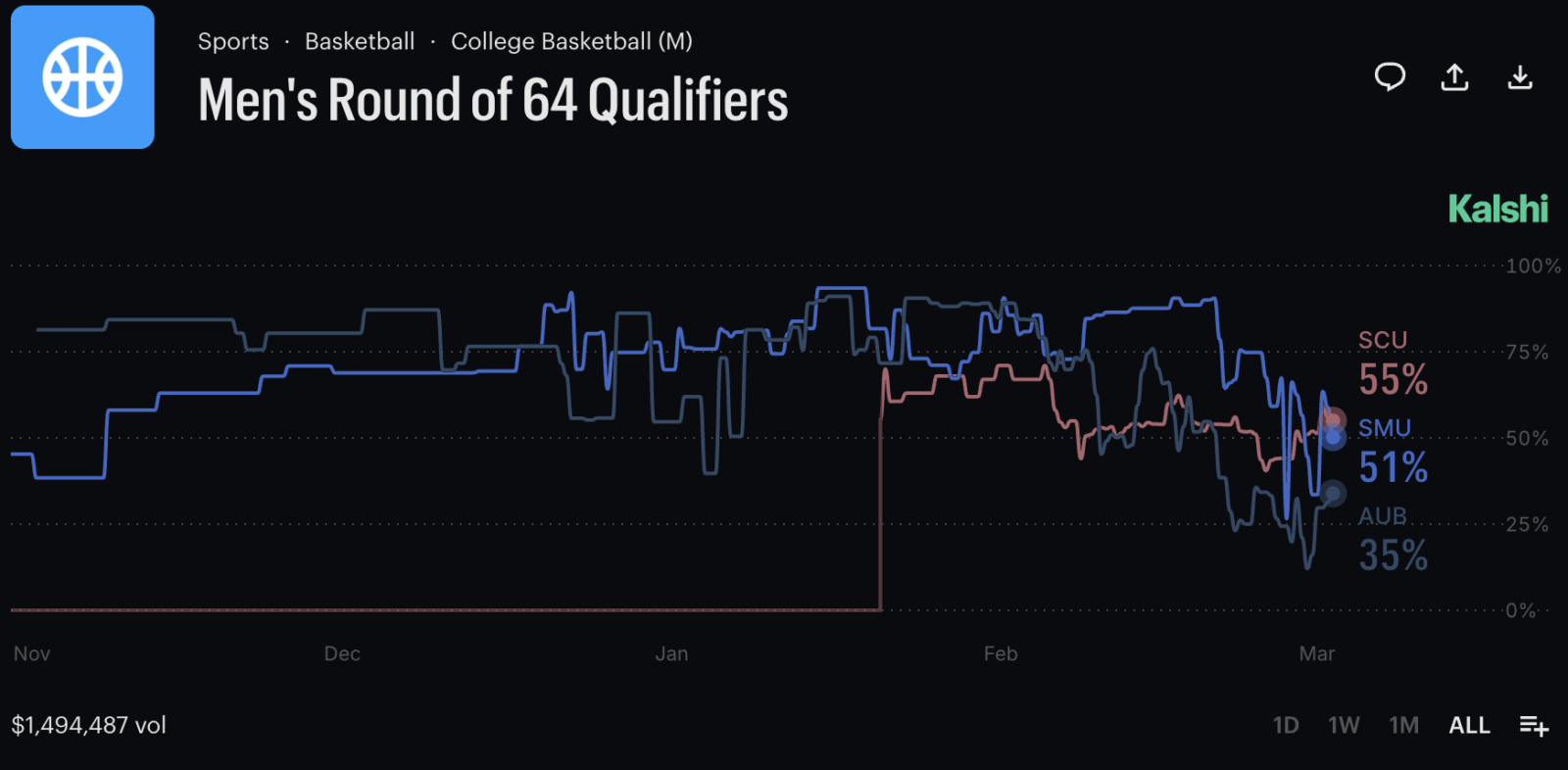 (It's also worth noting that the fine print is really important for this market. If a team that you bet "Yes" on makes a First Four game in Dayton, that isn't enough to resolve the market result to "Yes." The odds only resolve to "Yes" if the team wins the First Four game, or qualifies for the NCAA Tournament without playing in a First Four game.)