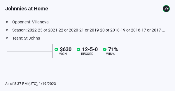 In recent history, this has been a good spot for the Johnnies. They've covered in five of their last seven tries hosting Villanova and 12 of their last 17 games against the Wildcats anywhere, per BetLabs.