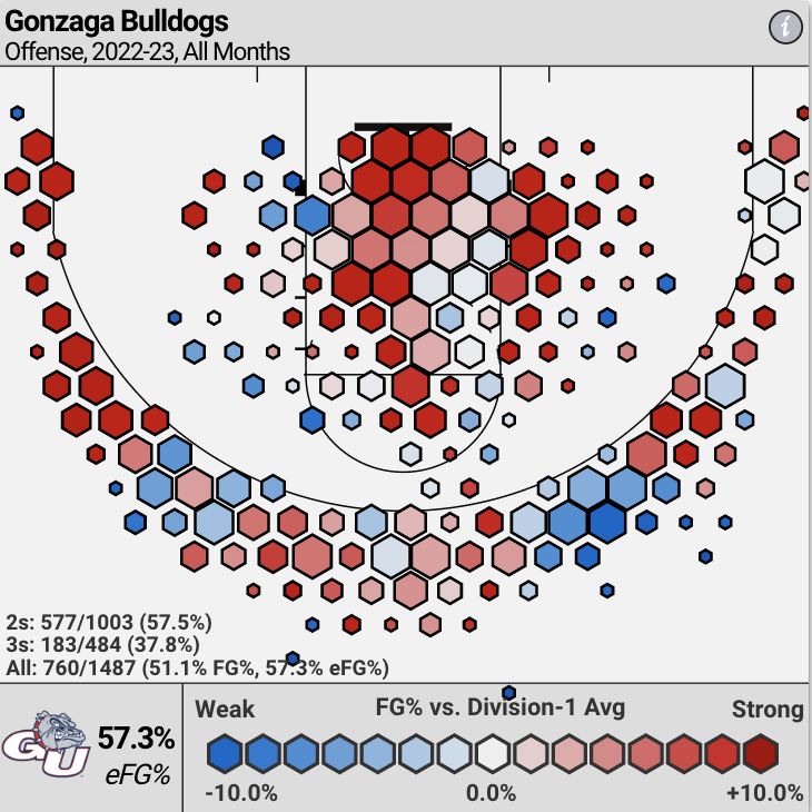 On the flip side, Gonzaga’s defense does have its problems. It's allowing teams to shoot 34.7% from 3-point distance. That said, the Zags rank 122th in Rim and 3 Rate, which is about average, per ShotQuality.
