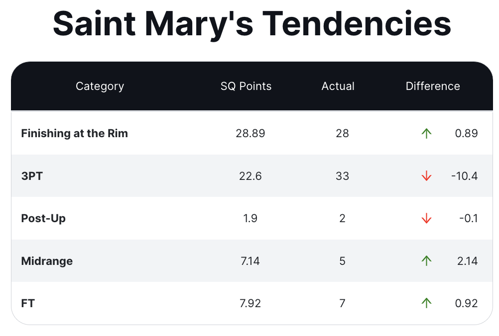 Saint Mary's also attacks the rim at a top-35 frequency in the country, but it isn't very effective in doing so, only hitting 56.6% on those shot attempts at the rim, which is 281st in the country, per Hoop-math.com.