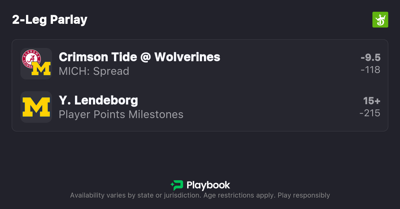 Dusty May’s Wolverines enter this contest as a 9.5-point favorite over a short-handed Crimson Tide bunch. Below, I will highlight a “Same-Game Parlay” (SGP) that I will be targeting ahead of this matchup.
