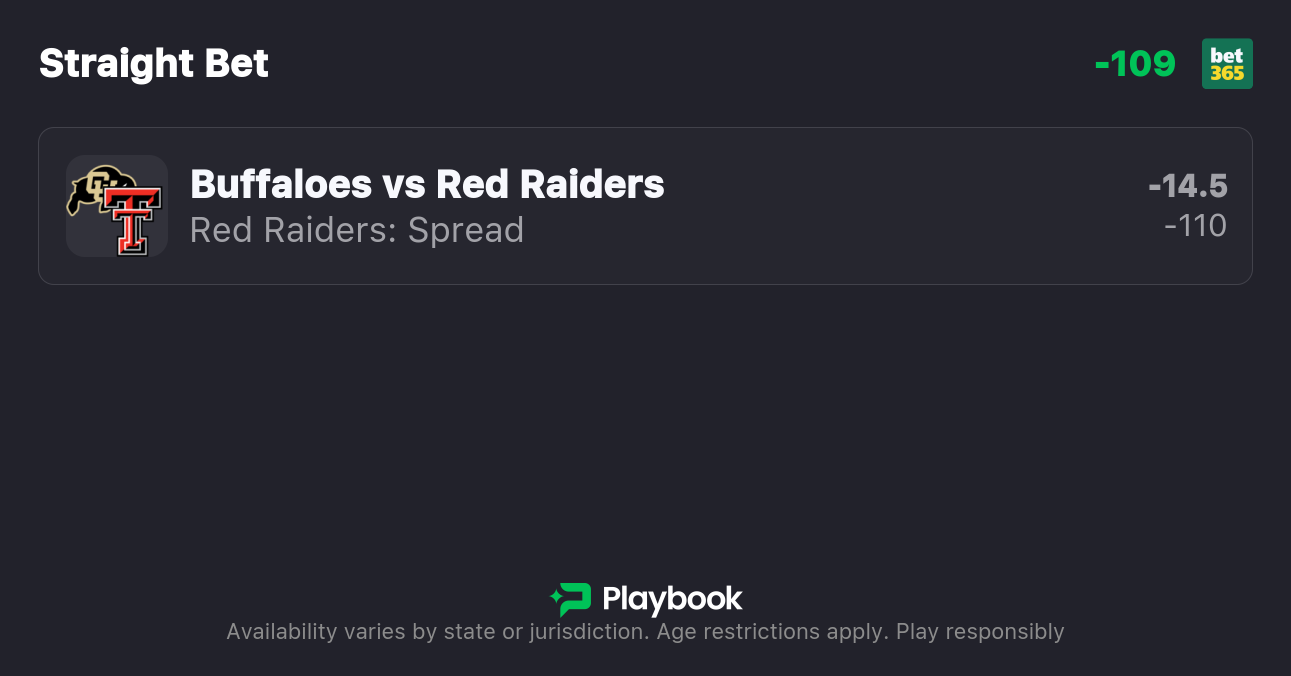 - Colorado vs Texas Tech spread: Texas Tech -14.5