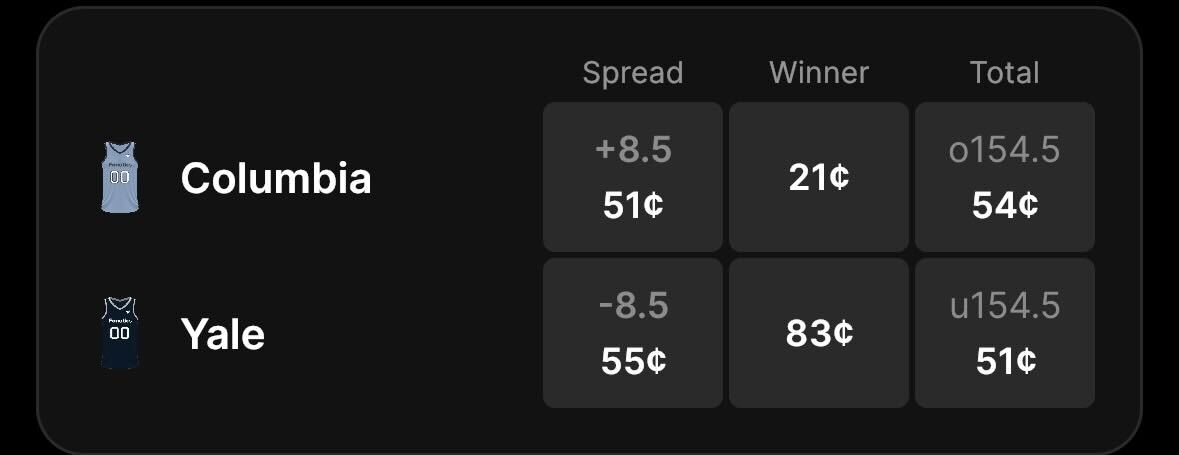 Yale is favored by 8.5 points on the spread with a price of 83 cents to win and the total set at 154.5 points on Fanatics Markets.